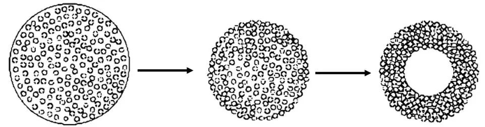 噴霧干燥法是制備噴涂涂層用原料的重要方法,通過使用適當的有機黏合劑聚集不同的小顆粒進而從漿料中經干燥獲取顆粒團聚體。漿料在干燥過程中發生快速傳熱和傳質,根據操作參數、漿料特性的不同,得到諸如空心、致密、多孔等形態各異的球形或其他形狀的顆粒團聚體[32,33]。噴霧造粒得到不同結構的團聚顆粒如圖2[32]所示。漿料在噴霧干燥過程霧化為球形液滴后的快速干燥階段,液滴中的水分快速蒸發產生毛細管力,進而液滴內部的細小顆粒在毛細管力的作用下向表面遷移并最終形成空心顆粒,如圖3[34]所示。因此,在噴霧干燥過程中,漿料的分散性是決定團聚顆粒結構的關鍵因素,高分散性漿料中細小顆粒的遷移阻力更小,更有助于獲取具有空心結構的顆粒團聚體。