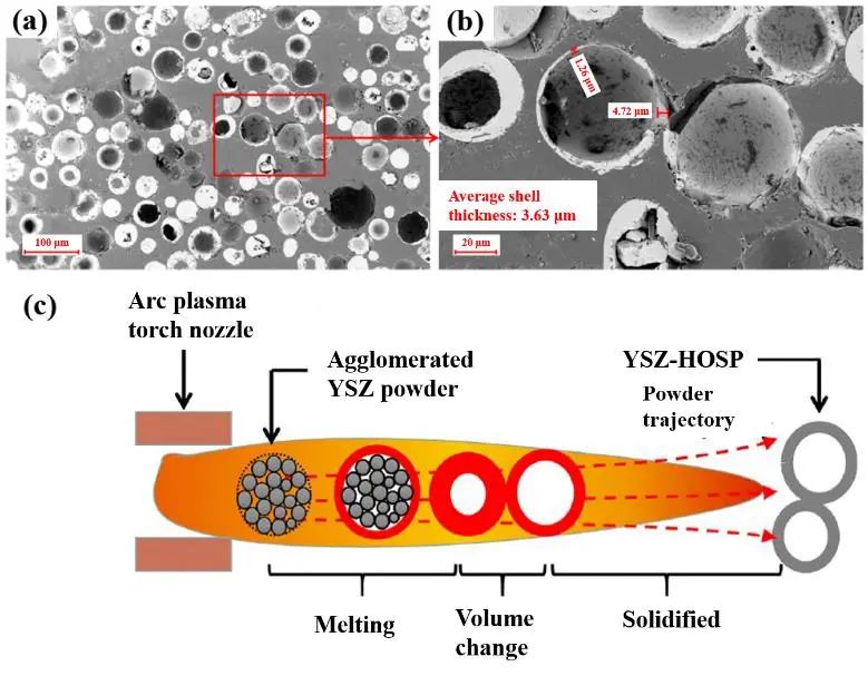 Qiu等[52]以中位徑46.43 μm且空心比例不足10%的YSZ粉末為原料,采用三陰極等離子體炬燒結制備得到了球化率接近100%、顆粒中位徑52.38 μm、空心顆粒比例93.4%且平均壁厚僅為3.63 μm的四方相YSZ粉末,合成的空心微球及顆粒的空心化過程如圖5所示。