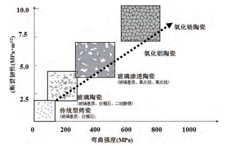 圖1 常見口腔陶瓷材料的結(jié)構(gòu)與力學(xué)性能比較